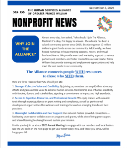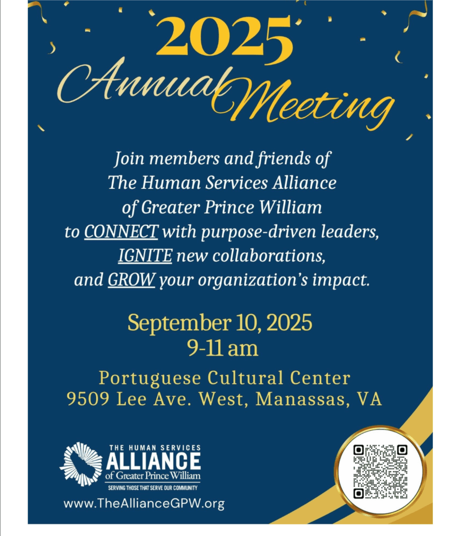 2025 Annual Meeting – The Human Services Alliance of Greater Prince William + Add to Google Calendar + iCal / Outlook export Tags: manassas, meeting Date Sep 10 2025 Expired! Time 9:00 am - 11:00 am Location Portuguese Cultural Center 9509 Lee Ave. West, Manassas, VA Website https://thealliancegpw.org Share this event