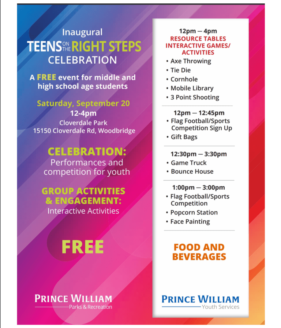 Inaugural Teens On The Rights Steps Celebration A FREE event for middle and high school age students + Add to Google Calendar + iCal / Outlook export Tags: celebration, high school, middle school, woodbridge Date Sep 20 2025 Expired! Time 12:00 pm - 4:00 pm Location Cloverdale Park 15150 Cloverdale Rd, Woodbridge, VA Share this event